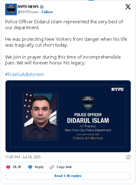 Finalmente, las autoridades destacaron el heroísmo del oficial Didarul Islam, quien murió protegiendo a otros. Era un inmigrante bangladesí, padre de dos hijos y esperando un tercero. Había servido en el Departamento de Policía durante tres años y medio. “Hizo el sacrificio máximo”, afirmó Tisch. Mientras tanto, testigos como Mama Bouhenni, empleada de una cafetería cercana, describieron escenas de pánico y desesperación. “Espero que todos puedan regresar a casa sanos y salvos”, dijo Bouhenni. El incidente dejó a la ciudad conmocionada y bajo investigación.
