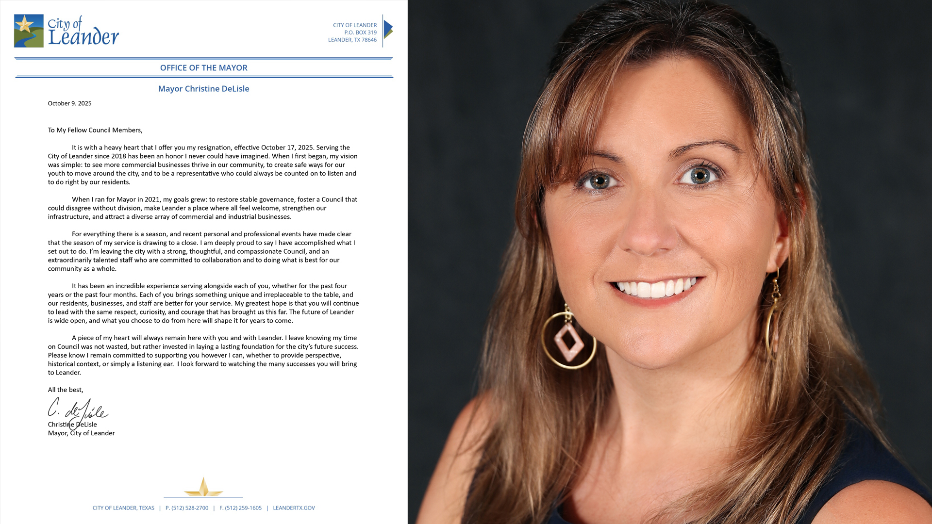 La alcaldesa de Leander, Christine DeLisle, anunció oficialmente su renuncia al cargo, efectiva el 16 de octubre de 2025, luego de que el Concejo Municipal acepte su...