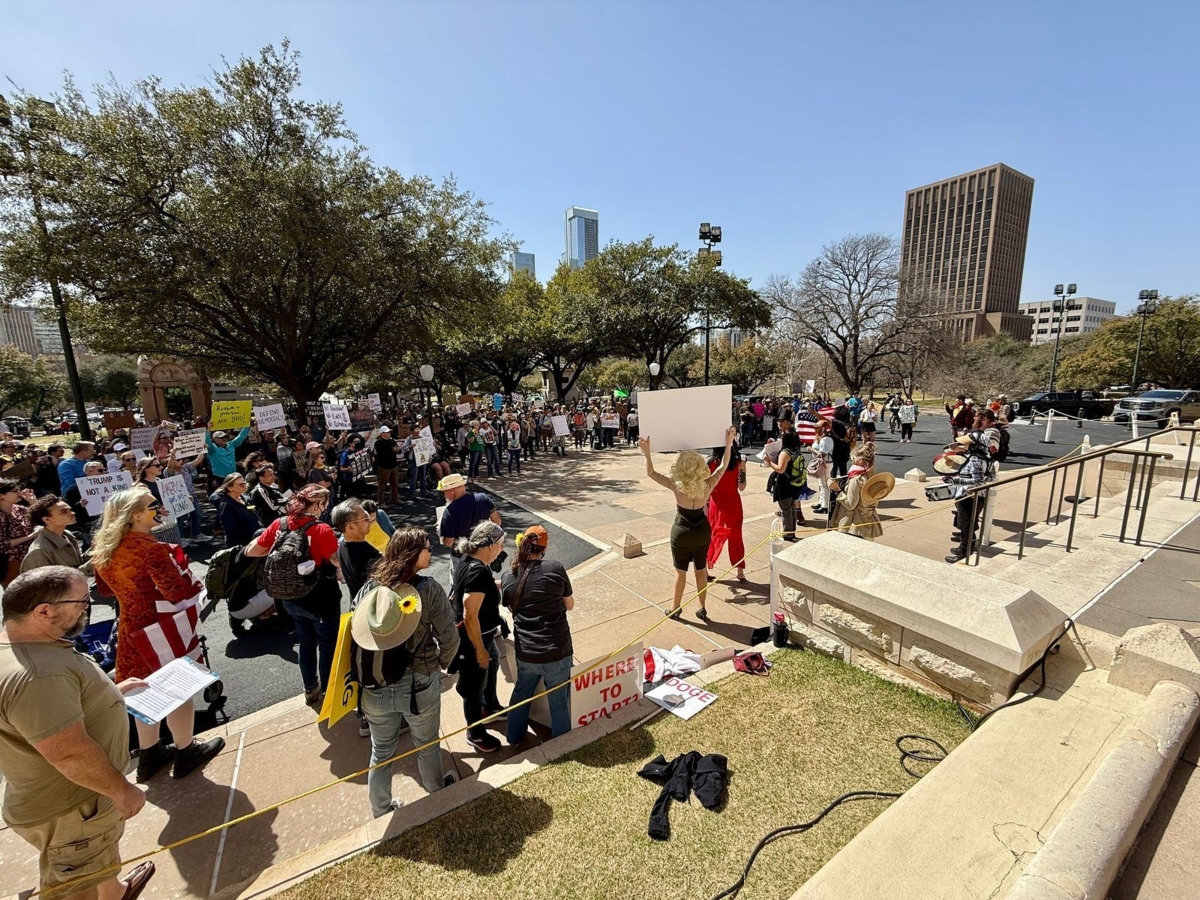 Manifestantes en Texas protestan contra Trump y el Proyecto 2025, alertando sobre riesgos para la democracia, derechos civiles e instituciones gubernamentales.